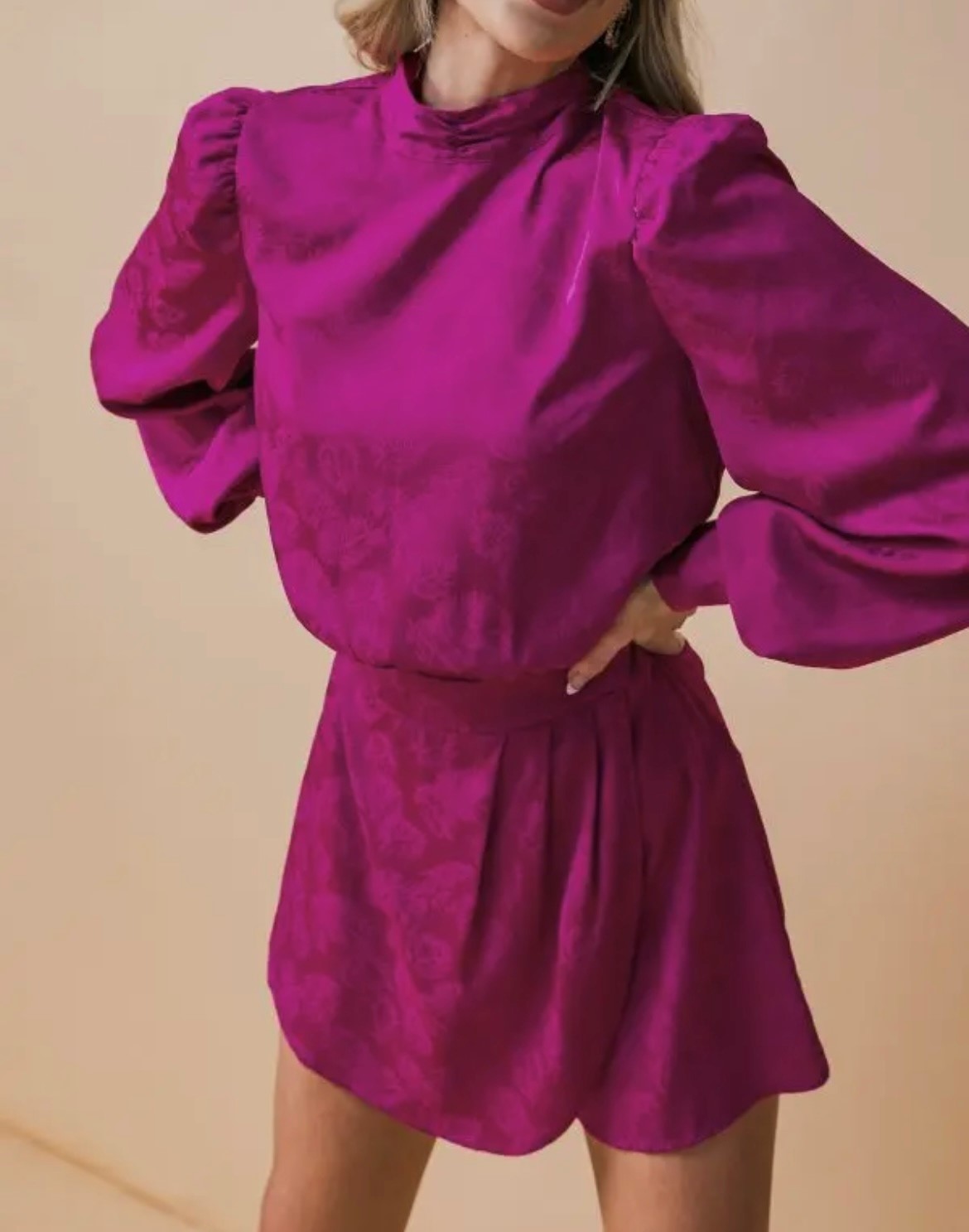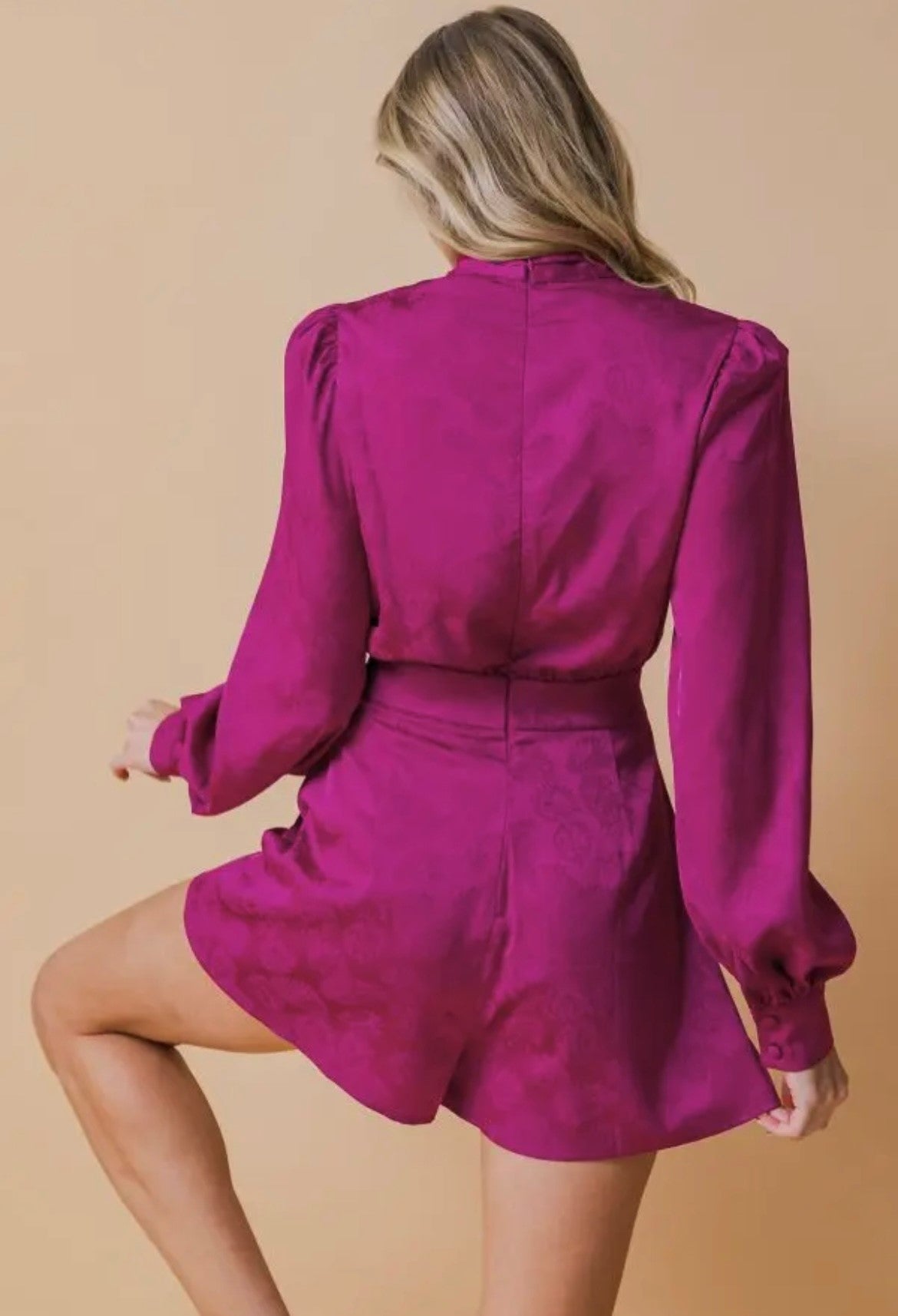A jacquard satin romper featuring high neckline with ruching, puff long sleeve with cuff, skort with front overlay and back zipper closure