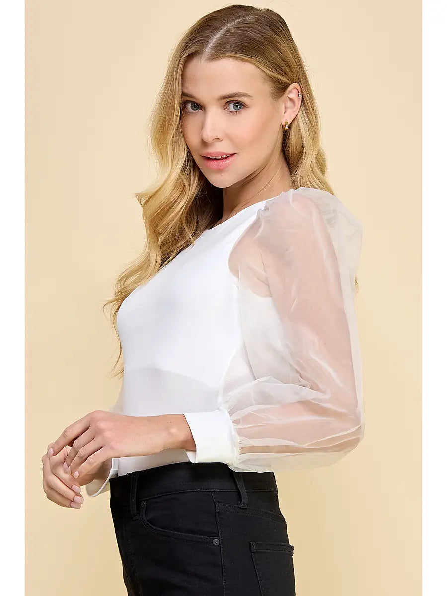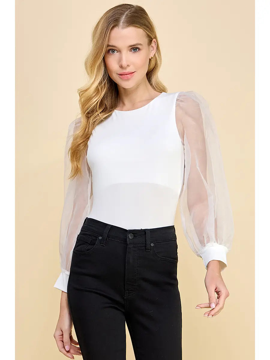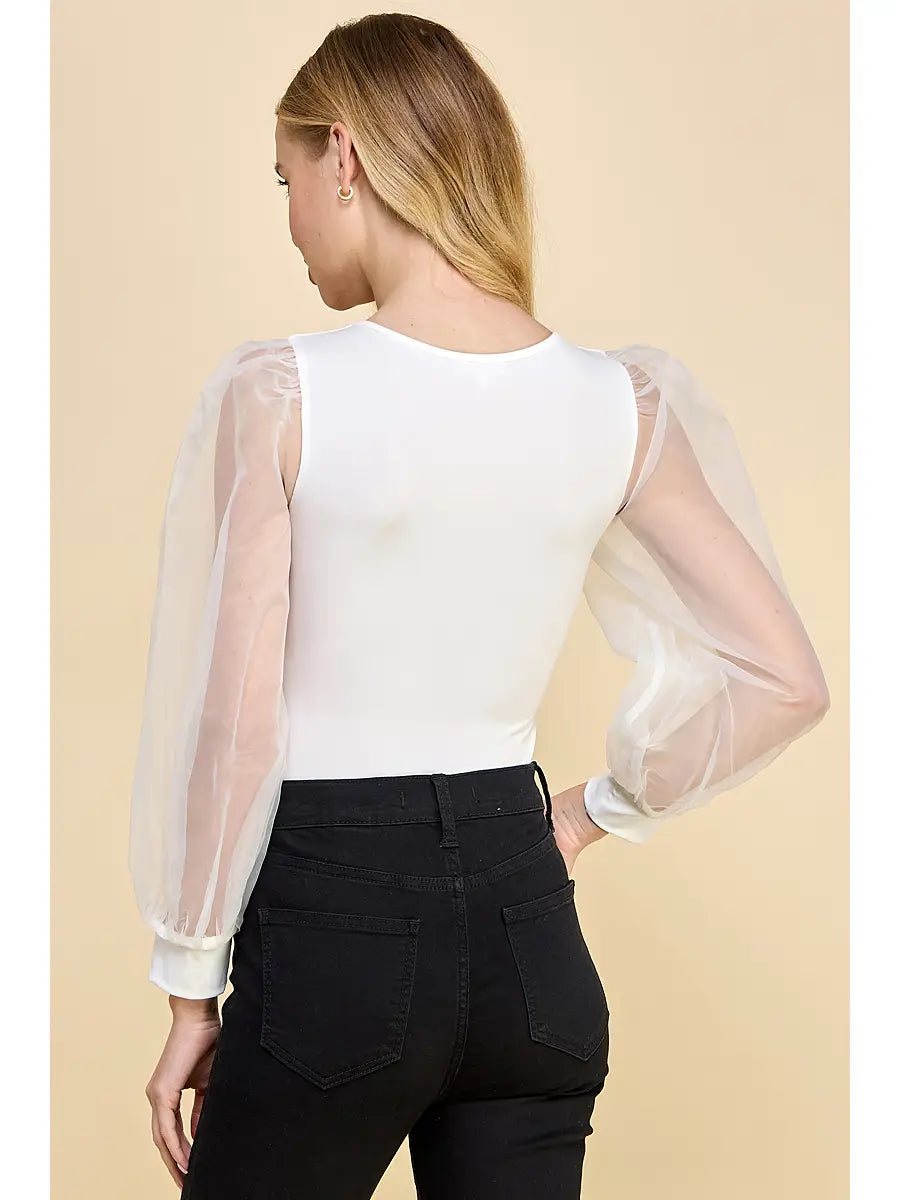 Knit boat neck bodysuit with sheer organza puff sleeves.