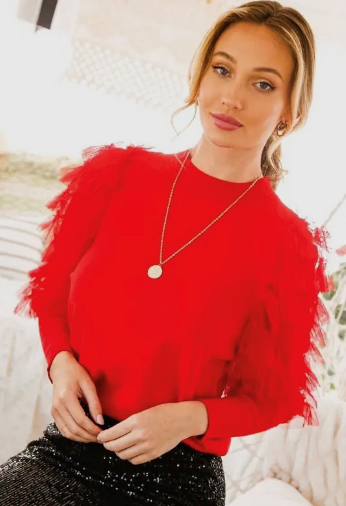 Mock Neckline Sweater With Tiered Lace Detail On Sleeves - Red