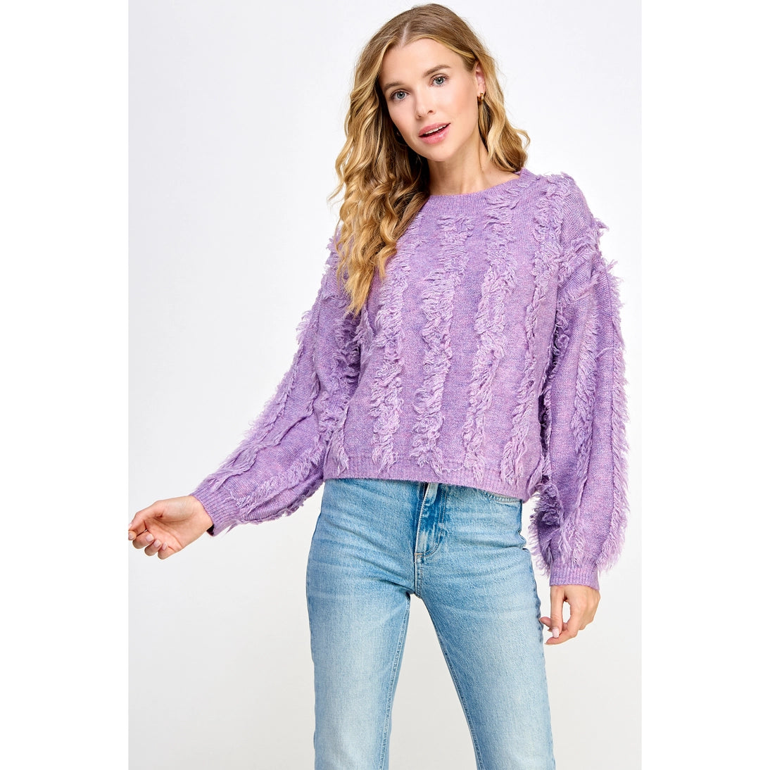The Murre soft fringe textured detail balloon sleeve pullover knit sweater. This style features long sleeves, ribbed cuff/neck, and a round neck.