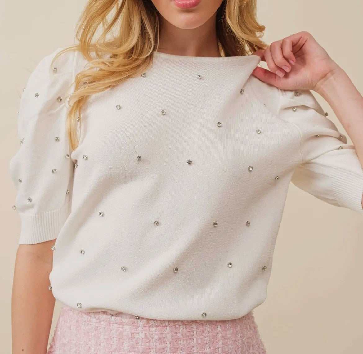 Round Neck Puff Short Sleeve Rhinestone Sweater Top 100% ACRYLIC