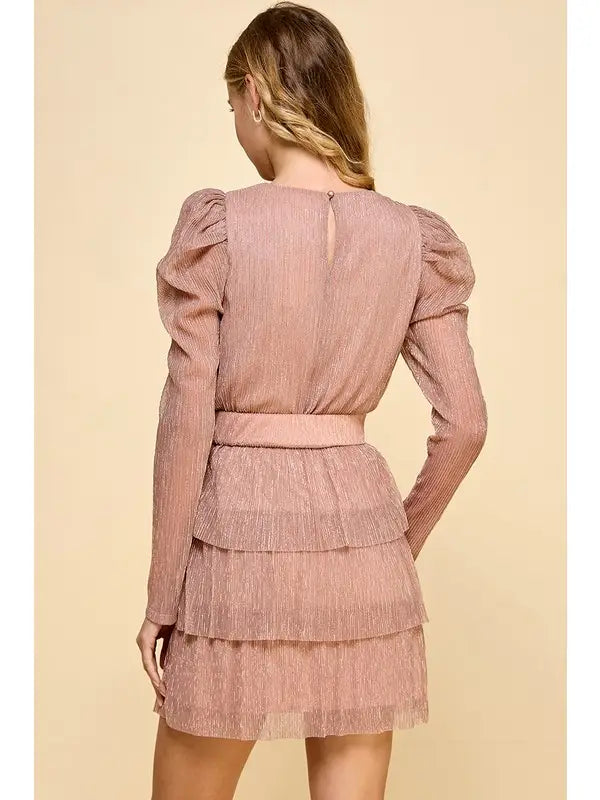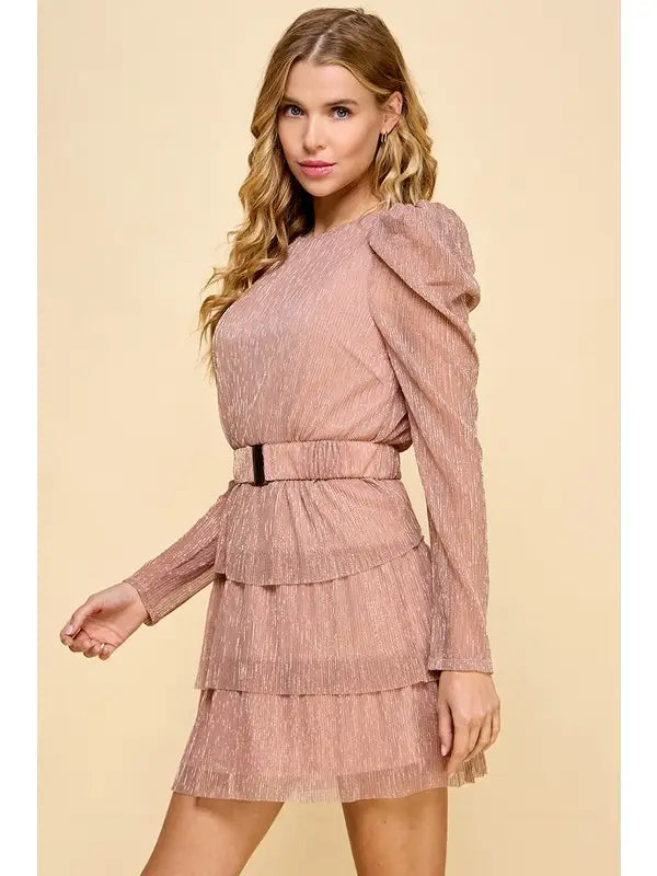 Round neckline, puff sleeve glitter dress. Featuring a tiered ruffle skirt, detachable waist tie and back keyhole with button closures.